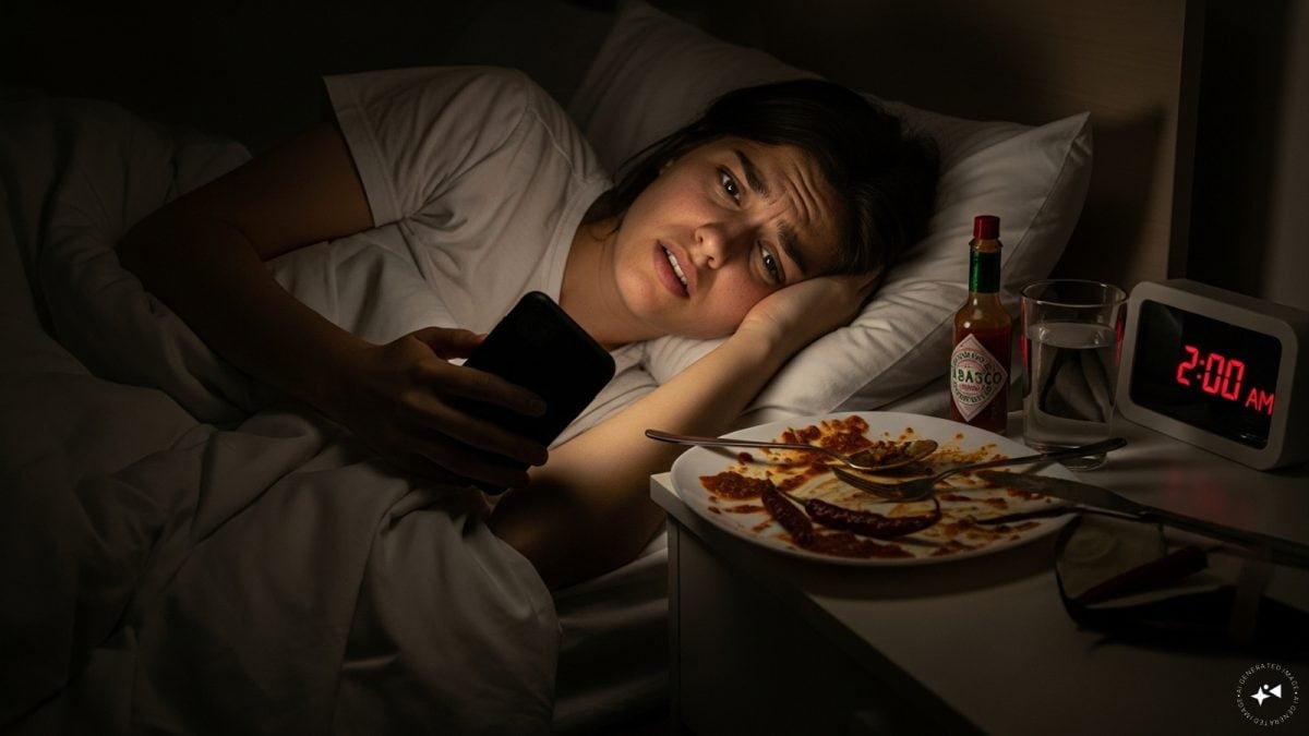 Spicy Foods: Chili, hot sauces, and spicy curries can trigger heartburn and acid reflux. Eating spicy meals too close to bedtime may cause discomfort, disrupting sleep quality. (Image: AI Generator)