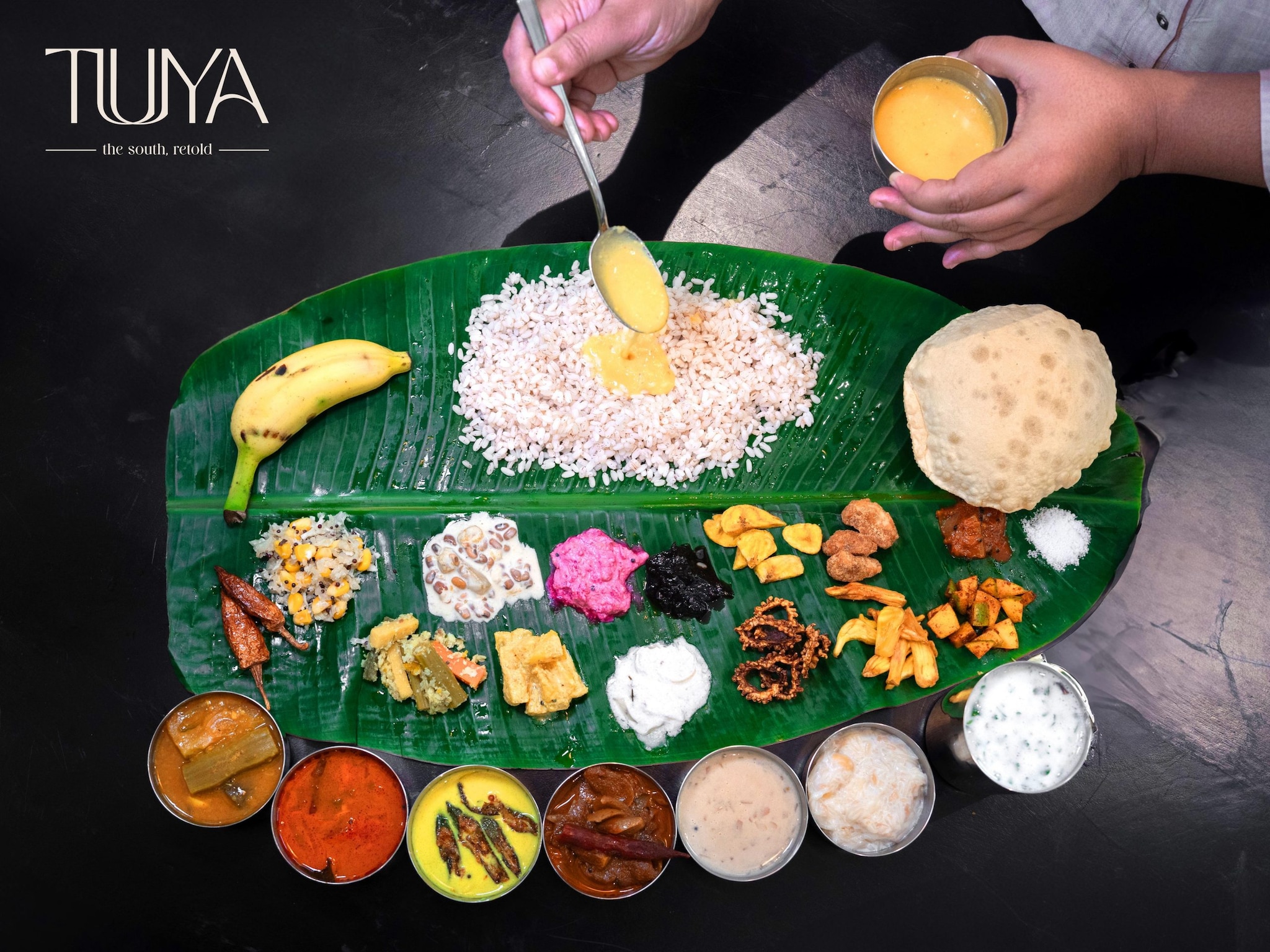 Prepared under the guidance of Chef Suresh DC, the sadhya embraces comfort, balance, and quiet finesse. Each dish is rooted in familiar Kerala flavours, cooked with restraint, and presented in the welcoming style that defines Tuya. Guests are invited to savour a banana-leaf style experience that begins with refreshing sambaram and crisp condiments, continues through soothing gravies and hearty matta rice, and concludes with the indulgent sweetness of traditional payasams.