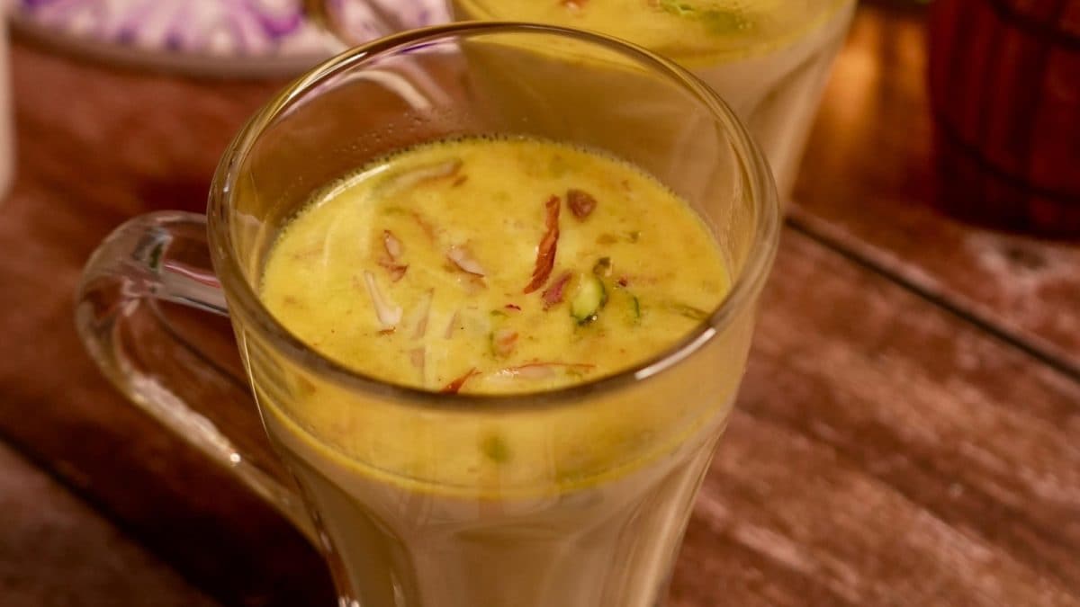 This drink is easy to prepare and starts with melting ghee and roasting besan or chickpea flour till it is nutty. Whisk in the milk and add haldi, black pepper, dry ginger powder, and cardamom. Dry fruits add richness, while jaggery sweetens it.