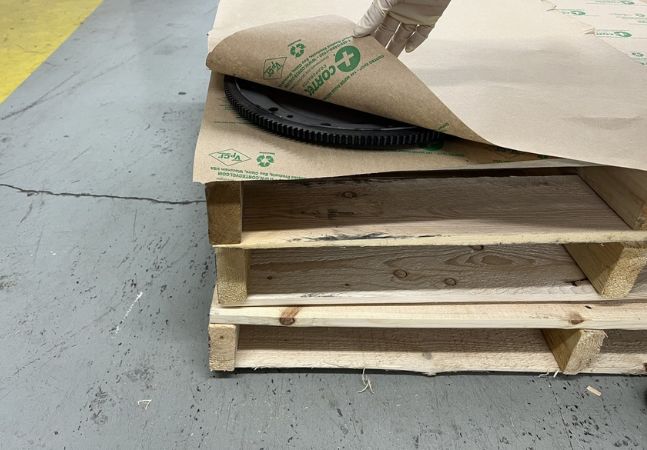 In addition to manual application, the material is compatible with automated packaging systems. One automotive manufacturer utilized the paper in a robotic process where machines cut the paper to size and placed it between layers of brake rotors. The process concluded with automated stretch film wrapping for shipment.
