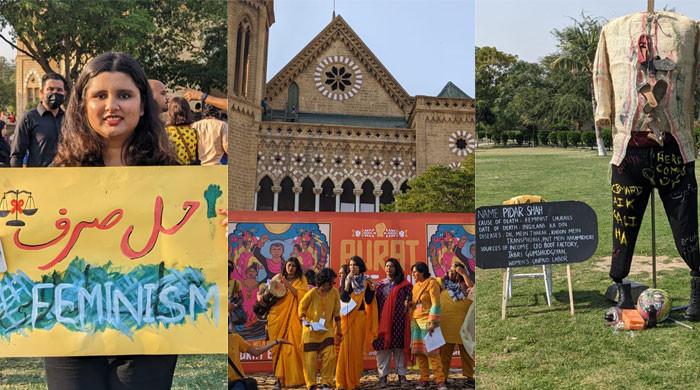 Aurat March in Karachi, named “Aurat Ehtejaji Mela aur March 2024”, was staged at the city’s iconic Frere Hall on the occasion of International Women’s Day — celebrated on March 8 every year.