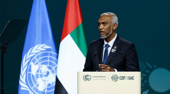 President of the Maldives Mohamed Muizzu delivers a national statement at the World Climate Action Summit during the United Nations Climate Change Conference (COP28) in Dubai, United Arab Emirates, December 1, 2023.—Reuters