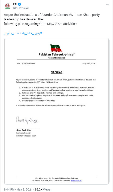 The May 9 events refer to violent protests triggered by the arrest of former prime minister Imran Khan in a corruption case from the premises of Islamabad High Court (IHC) last year.