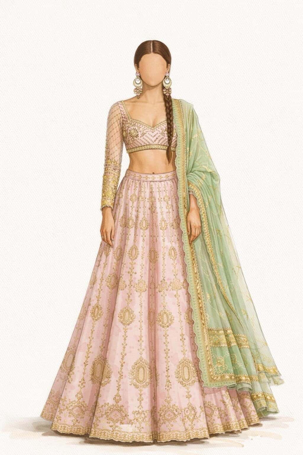 Mirroring the divine dance of Radha and Krishna that has lived for centuries in Indian miniature paintings, temple murals and folklore, Torani brought the vision to life in the custom ensemble featuring an embroidered lehenga set crafted in pure raw silk and realised in soft shades of lotus pink, sage and peacock green.