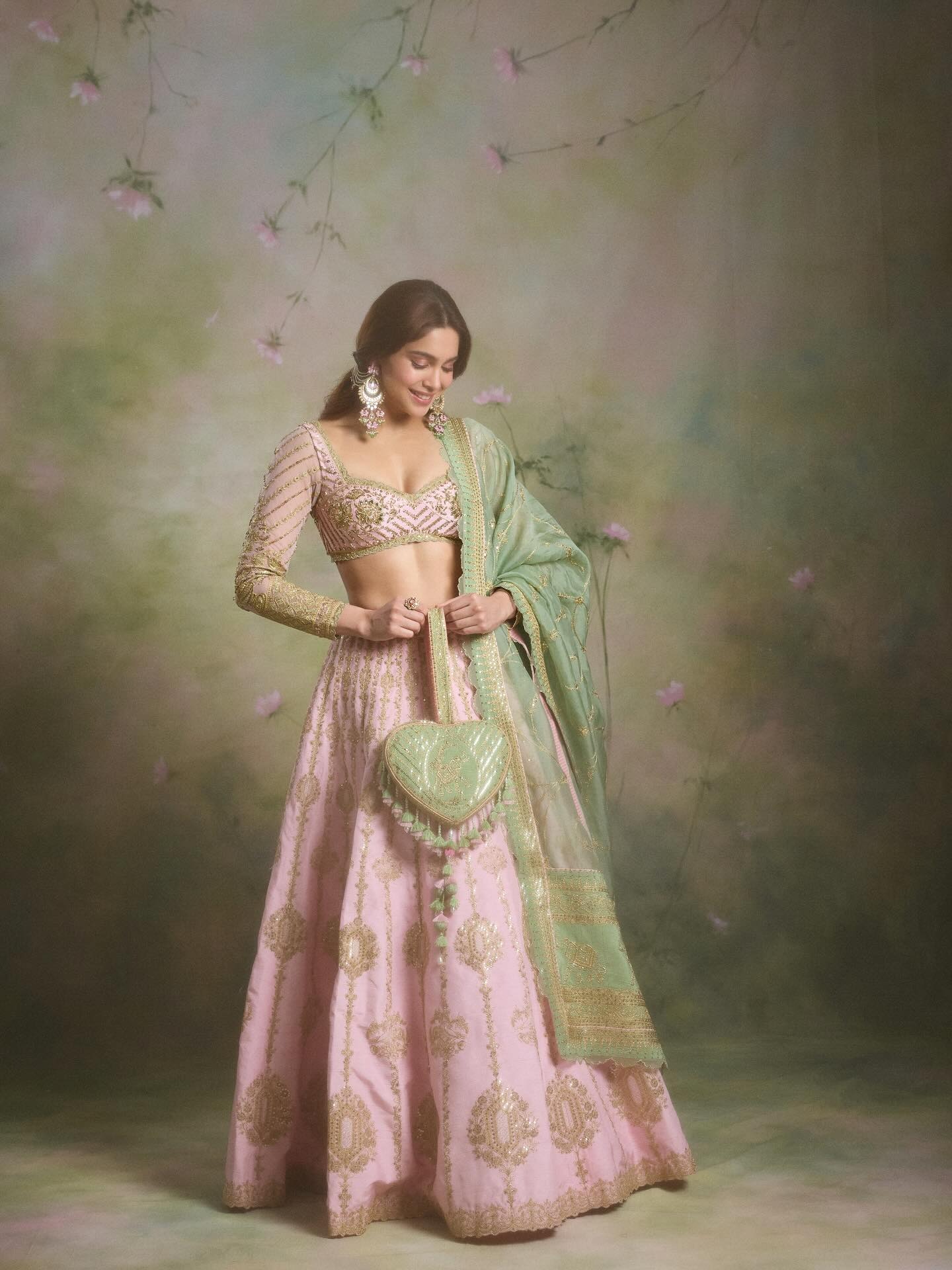 Actor Sharvari paired the lotus pink, sage and peacock green lehenga set with Torani’s iconic Dilbar potli.