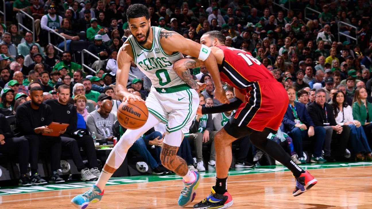The floodgates opened in the third when the Celtics, with ball movement and ample floor spacing, drilled seven 3s and outscored the Heat by 17 in the quarter. Through three quarters of play, Boston had knocked down 19 3s to Miami’s five — a 42-point margin from behind the arc. Tatum facilitated much of the offense by letting the Heat’s zone attack pressure him with two defenders before quickly swinging the ball back across the floor to a more open shooter. Porzingis, Derrick White and reserve Sam Hauser each finished with four 3s, while Brown knocked home three of his own. The Celtics led by as much as 34 early in the fourth, and Boston fans began doing the wave inside the arena.