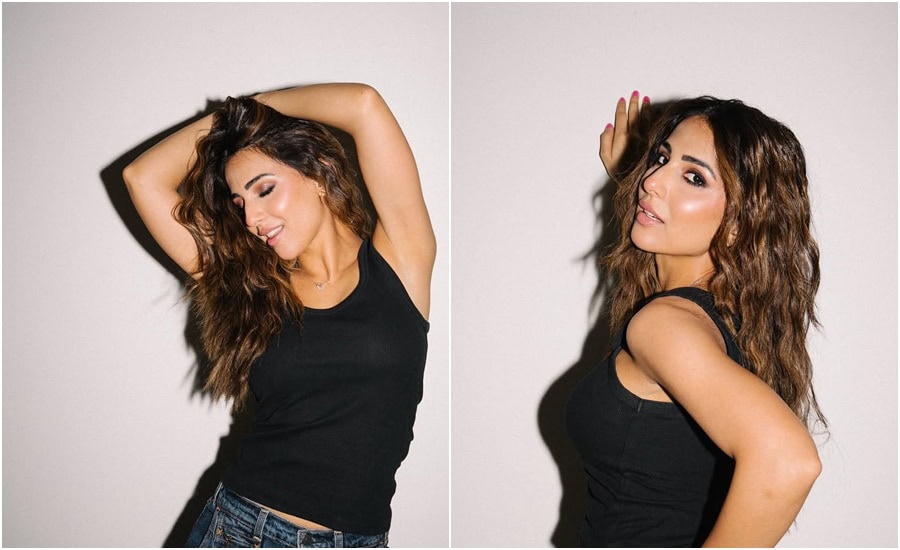 The shoot, titled with ‘Six inch walker,’ shows Ushna donning casual black top that highlights her silhouette, perfectly paired with stylish, light-wash Levi’s denim jeans, as tagged in the credits. The “six inch walker” reference likely alludes to a pair of towering, statement heels or boots, adding a dramatic edge to the otherwise minimal attire.